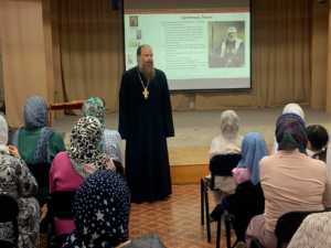 Мероприятие началось с вводной беседы отца Гурия, в которой он подчеркнул огромное значение для каждого верующего в наше время, исповеднического подвига Патриарха Тихона для истории Русской Православной Церкви. Занятие сопровождалось демонстрацией тематической презентации, наглядно иллюстрирующей подвиги, ключевые аспекты служения Патриарха Тихона.
